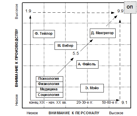 Учитывая важность понимания генезиса любого социального процесса или явления (в нашем случае – это научные основы организационного поведения), для наглядности проиллюстрируем взаимосвязь указанных концепций используя «управленческую решетку» Роберта Блейка и Джейн Моутон (см. рис.1). Заметим, что управленческие идеи М. Вебера и А. Файоля занимают промежуточное положение (5.5), как бы примиряя противоположности – концепции Ф. Тейлора (1.9) и Э. Мэйо (9.1).