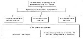 На большинстве предприятий служба снабжения предприятия представлена отделом (управлением) материально-технического снабжения. В его состав, как правило, входят: планово-экономическая группа (бюро); материальные группы, специализированные по видам материалов; диспетчерская группа (бюро); материальные склады (рис. ).