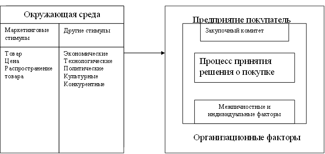 Для разработки удачной стратегии маркетингового комплекса субъект рынка должен хорошо представлять себе процесс преобразования внутри организации стимулов в покупательскую реакцию. Внутри организации деятельность по закупке включает два важных момента. Первый – организация закупочного комитета, в состав его входят все лица, участвующие в принятии решения о покупке. Второй – процесс принятия решения о покупке. Данная модель показывает, что закупочный комитет и процесс принятия решения подвержен влиянию внутренних организационных, межличностных и индивидуальных факторов точно также как и влиянию факторов внешней рыночной среды.