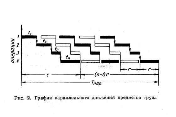 При параллельном виде движения обработка (сборка) каждой детали (машины) в партии (серии) на каждой последующей операции начинается немедленно после окончания предыдущей операции, независимо от того что обработка (сборка) других деталей (машин) в партии (серии) на данной операции еще не окончена. При такой организации движения предметов труда несколько единиц одной и той же партии (серии) могут одновременно находиться в обработке (сборке) на разных операциях. Общая продолжительность процесса обработки (сборки) партии деталей (серии машин) значительно уменьшается по сравнению с тем же процессом, выполняемым последовательно. В этом заключается существенное преимущество параллельного вида движения, позволяющего значительно сократить продолжительность производственного процесса.