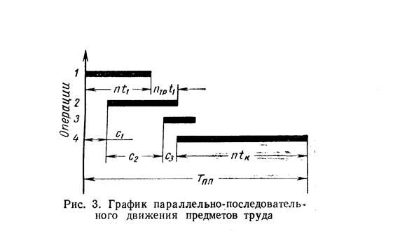 Необходимость выравнивания (синхронизации) длительности отдельных операций существенно ограничивает возможность широкого применения параллельного вида движения, что способствует применению третьего – параллельно-последовательного вида движения предметов труда.