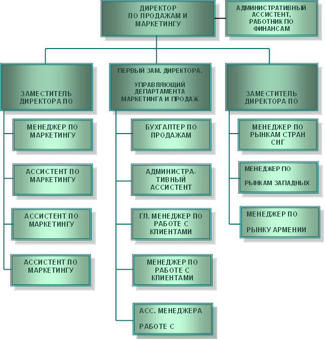 Для примера рассмотрим структуру маркетинговой службы Ереванского коньячного завода, представленную на Рис. 2.12.