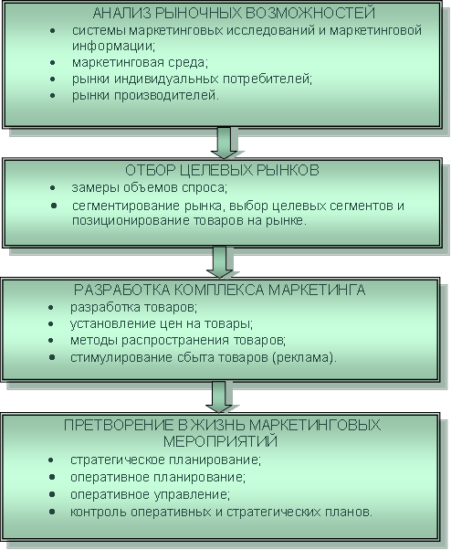 Более подробное описание подпунктов приведенных в каждом из разделов является самостоятельными направлениями исследований в маркетинге, и их изложение выходит за рамки данного учебного пособия. При желании более подробного ознакомления с этими исследованиями можно воспользоваться литературой приведенной в приложении Перечень литературы. В данном учебном материале дается общий обзор этапов и методов управления маркетингом.