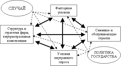 Для того чтобы получить и удержать конкурентные преимущества в передо­вых отраслях экономики, необходимо иметь преимущества во всех составляющих «ромба». Преимущества по каждому детерминанту в отдельности не есть посыл­ка для конкурентоспособности данной отрасли, поскольку конкурентам из зару­бежных стран значительно проще ликвидировать или скопировать такое преиму­щество. И только комплекс свойств страны определяет ее глобальное лидерство как конкурентоспособной державы мирового класса. Национальные конкурент­ные преимущества возникают только тогда, когда уникальным является весь «ромб», его в таком случае невозможно продублировать другим странам.