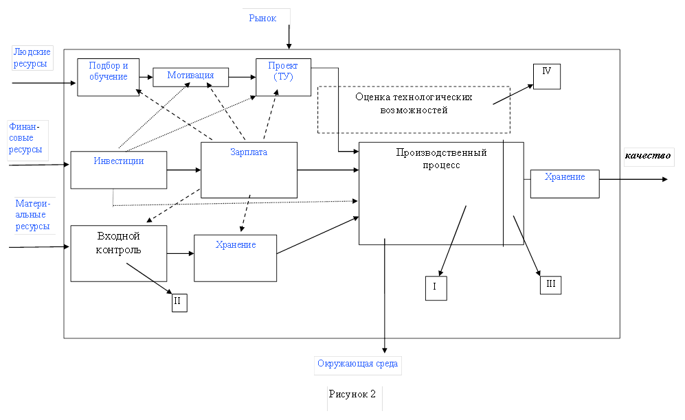 На рисунке 2 представлена частично раскрытая модель процесса в виде «белого ящика» применительно к промышленному производству. Более полно структура промышленного производства рассматривается в таких курсах как «Технология и организация производства», «Основы организации производства», «Управление процессами» и т.п. (практически любой спец. курс специальности «Управление качеством» в той или иной мере, с той или иной точки зрения «раскрывает» представленную на рисунке 2 модель производства). В курсе «Статистические методы в управлении качеством» подробно рассматриваются элементы, обозначенные на рисунке 2 римским цифрами, которые непосредственно связанны с управлением выходного потока, т.е. качества. Это прежде всего система управления производственным процессом (I), система приёмочного контроля качества: входной (III) и выходной контроль (II) и оценка технологических возможностей производства (IV).