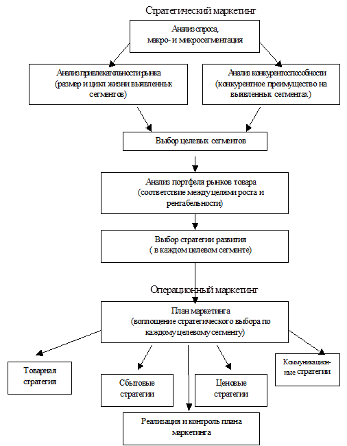 Стратегическая и операционная части маркетинга взаимно дополняют друг друга: структура стратегического плана должна быть тесно увязана с операционным маркетингом. Операционный маркетинг делает акцент на таких переменных в деятельности компании, как цена, система сбыта, реклама и продвижение товара, в то время как стратегический маркетинг нацелен на выбор товарных рынков, на которых фирма обладает конкурентным преимуществом, и на прогноз общего спроса на каждом из целевых рынков. Исходя из данного прогноза, операционный маркетинг устанавливает конкретные цели по завоеванию доли рынка, а также маркетинговый бюджет, необходимый для их достижения.