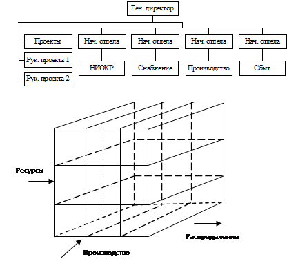 В соответствии с линейной структурой (по вертикали) строится управление по отдельным сферам деятельности организации НИОКР, производство, сбыт, снабжение и т.д. В рамках программно-целевой структуры (по горизонтали) организуется управление программами (проектами, темами).
