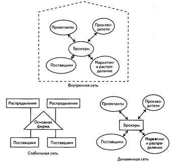 Движение к сетевой форме началось в 80-х гг., когда международная конкуренция и быстрые технологические изменения побудили к массивному реструктурированию во всех отраслях. В рамках общей тенденции к дезинтеграции руководители экспериментировали с различными организационными структурами. Вместо того чтобы использовать оперативные календарные планы и передачу информации о ценах для координации деятельности внутренних подразделений, они обратились к контрактам и другим соглашениям для соединения вместе внешних компонентов в различные типы сетевых структур. Как показано на рисунке 1.23, некоторые сети объединяют поставщиков, производителей и органы по реализации продукции на основе долгосрочных стабильных отношений. Другие сети гораздо более динамичны, компоненты в ценностной цепи соединяются контрактным способом в интересах реализации проекта или производства продукции, а затем разъединяются, чтобы стать частью новой ценностной цепи для следующего предпринимательского проекта. Поскольку любые функции реализуются на контрактной основе, то можно легко заменить поставщиков, вследствие чего у компании с сетевой структурой снижаются необратимые затраты.