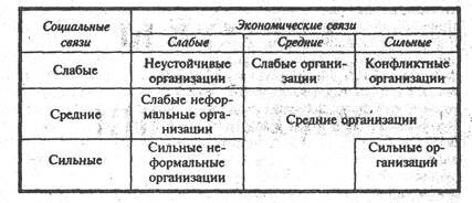 Для социально-культурных или социально-образовательных организаций таблица будет иметь такой же вид, если заменить слова «экономические связи» на культурные или образовательные. Эта таблица имеет очень большое практическое значение при организации или диагностике организации, и мы советуем разобраться в ней самостоятельно.