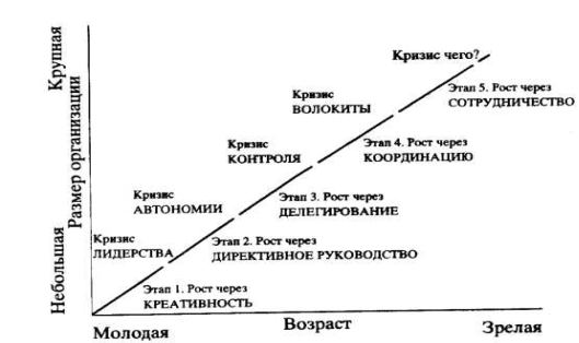 Он пришел к выводу, что важнейшими параметрами, определяющими модель развития организации, являются возраст организации, размер организации, этапы эволюции, этапы революции и темпы роста отрасли.