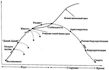 Пик исследований, связанных с жизненным циклом организации, пришелся на 1980-е гг., чему способствовала публикация книги Кимберли. Весьма серьезным шагом в развитии моделей жизненного цикла организации стали работы американца Айзека (Исаака) Адизеса. Во-первых, развитие организации подобно эволюции живого организма: отсюда и названия некоторых этапов (рис. 1.9).