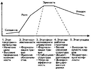 1. Этап предпринимательства. Организация находится в стадии становления, формируется жизненный цикл продукции. Цели являются еще нечеткими, творческий процесс протекает свободно, продвижение к следующему этапу требует стабильного обеспечения ресурсами.
