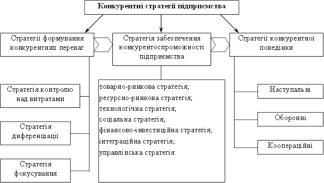 Конкурентная стратегия фирмы позволяет дать ответ на вопрос, как фирма конкурирует на целевом рынке, за счет чего она выдерживает конкурентное давление и получает победу в конкурентной борьбе?» [151]. При том, что в разных источниках эти стратегии имеют разные названия – “конкурентные стратегии”, “маркетинговые стратегии”, “предпринимательские стратегии”, корпоративные стратегии”, “портфельные стратегии” «стратегии бизнеса» и тому подобное, речь всегда идет об одном и том же – как предприятию действовать на рынке.