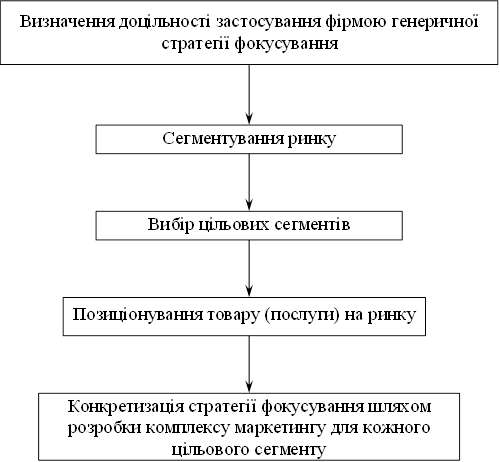 Для конкретного предприятия стратегия фокусировки представляет собой комплекс решений относительно перечня целевых сегментов, на которых будет работать фирма, и способа позиционирования товара (услуги) предприятия в каждом из целевых сегментов.