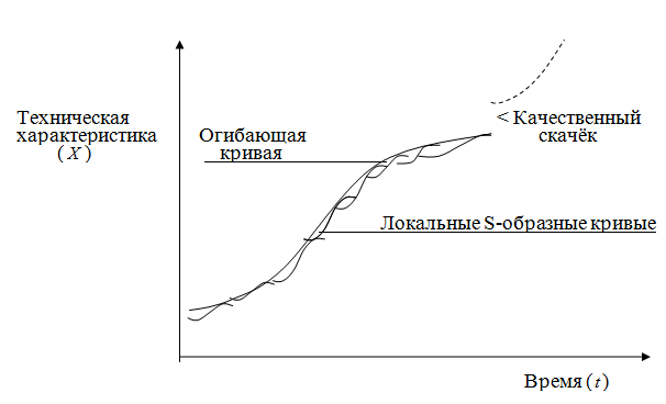 Следует также отметить, что учёт данной закономерности при прогнозировании является условием необходимым, но недостаточным. Анализ развития технических характеристик по конкретному виду техники за длительный период времени показывает, что S-образная закономерность повторяется (рис. 1.2.2., локальные кривые).
