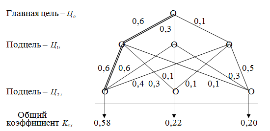Максимальные значение коэффициентов оценки значимости подцелей по уровням снизу вверх, то есть прогнозирование от будущего к настоящему, покажут целесообразные подцели развития производства. Тем самым, определится и направление (на рисунке 1.2.3 это путь, выделенный двумя линиями) достижения главной цели развития производства.