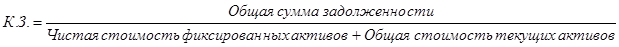 Низкое и ухудшающееся из года в год процентное покрытие вызывает большую тревогу у компании. При анализе кредитоспособности можно использовать еще один показатель — коэффициент задолженности (К.З.). Он фиксирует ту часть общей стоимости активов компании, которая финансируется за счет кредита и рассчитывается следующим образом: