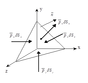 Рис. 5 | Рассмотрим тетраэдр, три грани которого параллельны координатным плоскостям, а четвёртая ориентирована произвольным образом ( рис. 5 ). Обозначим площади граней Ориентация площадки определяется единичной нормалью |