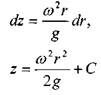 направленное в сторону стенок сосуда. Поскольку равнодействующая двух сил: силы тяжести и центробежной силы должна быть направлена по нормали к свободной поверхности жидкости в каждой точке поверхности, то эта равнодействующая будет иметь, как быль сказано выше, две составляющие соответственно силу тяжести, направленную вертикально вниз и центробежную, направленную в горизонтальной плоскости.