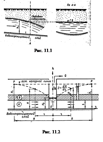 На рис. 11.1 представлено безнапорное движение грунтовых вод, которое характеризуется наличием свободной поверхности, во всех точках которой давление равно атмосферному. Линия, образующаяся на пересечении свободной поверхности с вертикальной плоскостью, параллельной скорости движения грунтовых вод, называется кривой депрессии (депрессионной кривой).