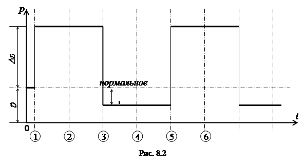 Но так как задвижка продолжает оставаться закрытой, жидкость продолжать свое движение не может и у задвижки вновь возникнет удар. На этом первый цикл заканчивается и начинается второй, который при отсутствии энергетических потерь будет повторять первый (точка 6 и т.д.).