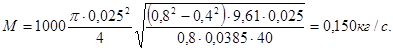 При  движении  газа  по  трубе  (по шлангу) диаметром d (м), длиной L (м), когда абсолютное давление в начале трубопровода равно p1  (МПа), а в конце – p2  (МПа), массовый расход  воздуха определяется по формуле: