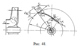 В центробежных насосах жидкость подводится к лопаткам рабочего колеса вдоль оси вала (рис. 48). При входе на лопатки происходит отклонение струй от осевого направления к радиальному. Жидкость на лопатки поступает с абсолютной скоростью , а на внешней окружности рабочего колеса скорость ее достигает величины .