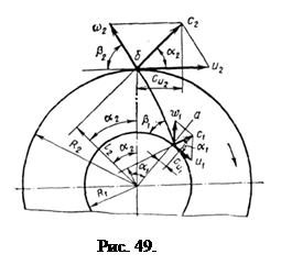 Абсолютная скорость движения жидкости равна геометрической сумме переносной (окружной) и относительной скоростей (параллелограмм скоростей на рис. 48)
