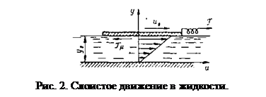 Механизм возникновения силы сопротивления можно представить следующим образом. Слой жидкости, прилегающей к пластинке, прилипает к ней и движется вместе с пластинкой со скоростью . Вследствие молекулярных связей этот слой увлекает за собой следующий и т. д. Поскольку нижний слой примыкает к неподвижной пластинке, его скорость равна нулю. Таким образом, в жидкости возникает слоистое движение с некоторым распределением скоростей по высоте и =f(y).