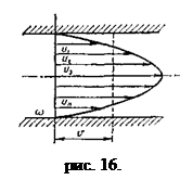 На рис. 16 представлен график (эпюра) распределения действительных скоростей в точках живого сечения потока, из которого видно, что скорости по сечению распределяются неравномерно. При действительных скоростях через живое сечение проходит определенный расход Q. Можно найти некоторую постоянную для всех точек сечения фиктивную скорость, при которой через данное сечение проходил бы тот же самый расход, что и при действительных скоростях движения жидкости. Эта скорость v будет средней из действительных скоростей. Подставляя в формулу (67б) скорость v получим