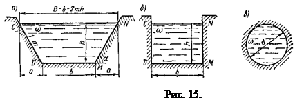 На рис. 15 приведены примеры поперечных сечений потока: а) трапецеидальное; б) прямоугольное; в) круговое.