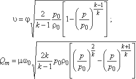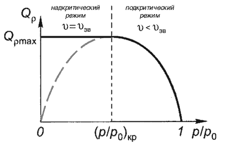 Как видно из графика, показанного на рис.11.2, при уменьшении p/p0 по сравнению с критическим расход должен уменьшаться (пунктирная линия) и при p/p0 = 0 значение расхода должно быть равно нулю (Qm = 0). Однако в действительности это не происходит.