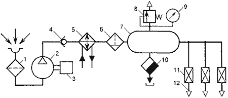 Компрессор 2 с приводным двигателем 3 всасывает воздух из атмосферы через заборный фильтр 1 и нагнетает в ресивер 7 через обратный клапан 4, охладитель 5 и фильтр-влагоотделитель 6. В результате охлаждения воздуха водяным охладителем 5 происходит конденсация 70-80 % содержащейся в воздухе влаги, улавливаемой фильтром- влагоотделителем и со 100-процентной относительной влажностью воздух поступает в ресивер 7, который аккумулирует пневмоэнергию и сглаживает пульсацию давления. В нем происходит дальнейшее охлаждение воздуха и конденсация некоторого количества влаги, которая по мере накопления удаляется вместе с механическими примесями через вентиль 10. Ресивер обязательно оборудуется одним или несколькими предохранительными клапанами 8 и манометром 9. Из ресивера воздух отводится к пневмолиниям 12 через краны 11. Обратный клапан 4 исключает возможность резкого падения давления в пневмосети при отключении компрессора.