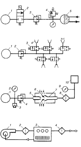 Все вышеописанные пневмосистемы относятся к разомкнутым (бесциркуляционным). На рис.11.4, г показана замкнутая схема питания системы пневмоавтоматики, используемая в условиях пыльной атмосферы. Подача воздуха к блоку пневмоавтоматики 3 осуществляется вентилятором 1 через фильтр 2, причем всасывающий канал вентилятора соединен с внутренней полостью герметичного кожуха блока 3, которая одновременно через фильтр тонкой очистки 4 сообщается с атмосферой. Часто в качестве вентилятора используются бытовые электропылесосы, способные создавать давление до 0,002 МПа.