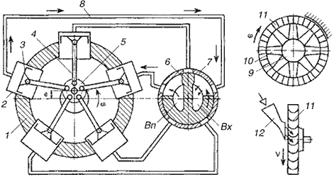 На рис.11.6, б показана схема пневмопривода колеса вентилятора, состоящего из ступицы 9 с лопаток 10, к которым жестко прикреплен вращающийся обод с лопатками пневмомотора 11. Поток сжатого воздуха, вытекающий из сопла 12 по касательной к изогнутым лопаткам 11, отдает свою энергию и заставляет вращаться колесо вентилятора с большой скоростью. Описанное устройство можно назвать пневмопреобразователем, преобразующим поток воздуха высокого давления в поток низкого давления с гораздо большим расходом.