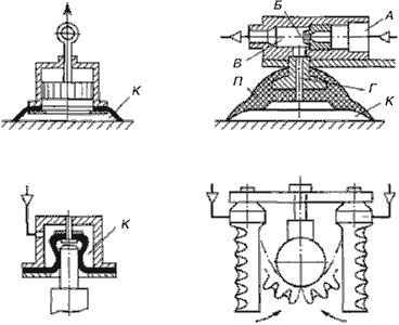 Часто применяют простые устройства эжекторного типа (рис.11.7, б), в которых кинетическая энергия струи жидкости, пара или воздуха используется для отсасывания воздуха из рабочей камеры К, находящейся между присоской П и деталью. Сжатый воздух, поступающий на вход А, проходит с большой скоростью через сопло Б эжектора и создает пониженное давление в камере В и канале Г, сообщающимся с рабочей камерой К.