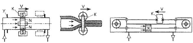 Отсутствие жесткого штока позволяет практически в два раза уменьшить длину цилиндра в выдвинутом положении. На схеме а показан длинноходовой пневмоцилиндр с передачей усилия через сильный постоянный магнит. Абсолютно герметичная гильза цилиндра выполнена из немагнитного материала, а ее внутренняя полость разделяется поршнем на две камеры, к которым подводится сжатый воздух. В поршне и каретке К, соединенной с рабочим органом, встроены противоположные полюса магнита S и N, взаимодействие которых обеспечивает передачу движущего усилия на каретку, скользящую по направляющим на внешней поверхности гильзы. Ход каретки ограничивается конечными упорами У.