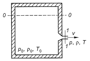 Рассмотри истечение газа из резервуара через небольшое отверстие при поддержании в резервуаре постоянного давления (рис.11.1). Будем считать, что размеры резервуара настолько велики по сравнению с размерами выходного отверстия, что можно полностью пренебрегать скоростью движения газа внутри резервуара, и, следовательно, давление, температура и плотность газа внутри резервуара будут иметь значения p0, ρ 0 и T0.