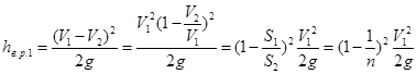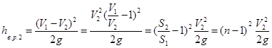 Когда площадь резервуара S2, велика в сравнении с площадью трубопровода S1 , S2/S1→∞ велико, а скорость V2→0 мала, потеря на расширение при выходе из трубы в резервуар