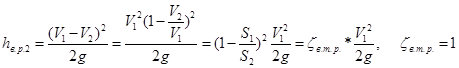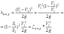Потеря напора при внезапном расширении равна скоростному напору, определенному по разность скоростей для турбулентного режима движения.