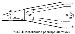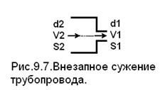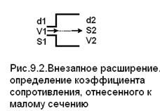 При внезапном сужении трубы (рис.9.7) потери энергии связаны с трением потока при входе в узкую трубу и с потерями на вихреобразование. Поскольку поток не обтекает входной угол, а срывается с него и сужается, поисходит вихреобразование. Кольцевое пространство вокруг суженной части потока заполнено завихренной жидкостью.