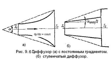 Применяют также ступенчатый диффузор, состоящий из обычного диффузора с оптимальным углом и следующего за ним внезапного расширения.