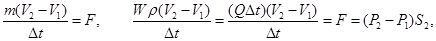Обозначим давление, скорость и площадь потока в сечении 1 – 1: Р1 , V1, S1 , а в сечении 2 – 2: Р2 , V2, S2.