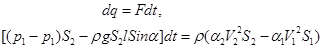 Эти интегралы дают количества движения масс жидкости, протекающей через живые сечения S1 и S2 в единицу времени. Они могут быть найдены через средние V1 и V2 скорости в этих сечениях: