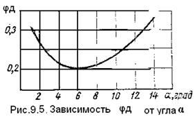 Функция φд =f(α) имеет минимум при угле α = 6º φд =0,2 (рис.9.5), для угла α = 10º φд =0,23-0,25.