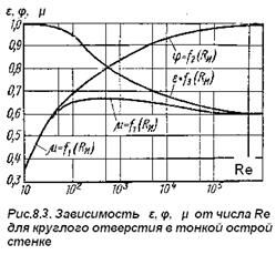 На рис. 8.4 показаны составленные А.Д. Альтшулем  зависимости для  коэффициентов ε,   φ  и  μ  для круглого отверстия в функции  числа .