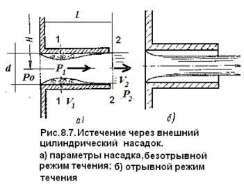 Внешним цилиндрическим насадком называется короткая трубка длиной, равной l = (1÷5)d с острой входной  кромкой (рис.8.7).  Истечение через такой насадок в атмосферу может происходить  в двух режимах.
