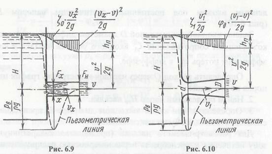 Наглядное представление об изменениях напора потока и его составляющих при истечении жидкости через насадок дается гра­фиком напоров (см. рис. 6.9). Линия напора и пьезометрическая линия на этом графике качественно изображают ход изменения полного и гидростатического напоров по длине насадка от началь­ного сечения перед входом в насадок до его выходного сечения.