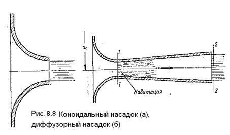 Такие насадки применяют, когда заданы диаметр узкого сечения и напор и требуется получить возможно больший расход. Однако, используют диффузорные насадки при небольших  напорах Н = 1 ÷4 м, так как иначе в узком месте насадка возникает кавитация.  Следствием кавитации являются увеличение сопротивления и уменьшение пропускной способности насадка.