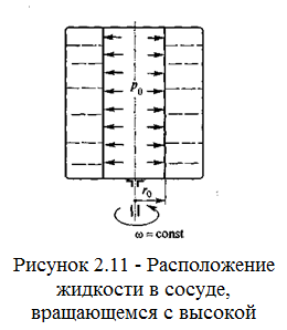 На практике часто встречается другой частный случай — вращение сосуда с очень высокой скоростью. В этом случае центробежные силы существенно больше сил тяжести и жидкость отбрасывается центробежными силами к стенкам сосуда (рисунок 2.11), а ее свободная поверхность располагается на радиусе r0. Тогда некоторыми геометрическими величинами, входящими в формулу (2.12), можно пренебречь и формула для определения давления упрощается: